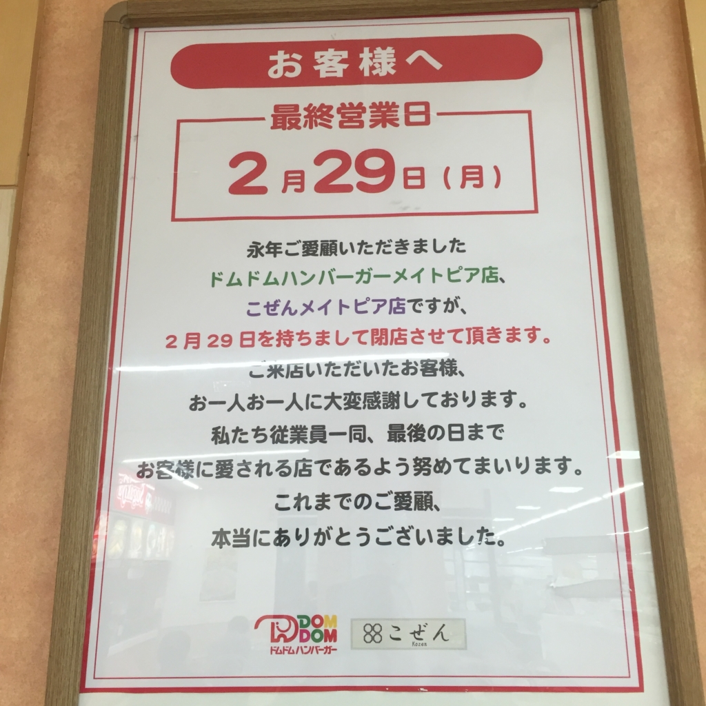 赤坂にあるから赤坂サカス、名東区にあるからメイトピアです。(Podcast内ではダイエーと言われてますが、今はイオン)フードコートにある「ドムドムハンバーガー イオンメイトピア店」が2月29日で閉店。愛知県内のドムドムハンバーガー全滅です。