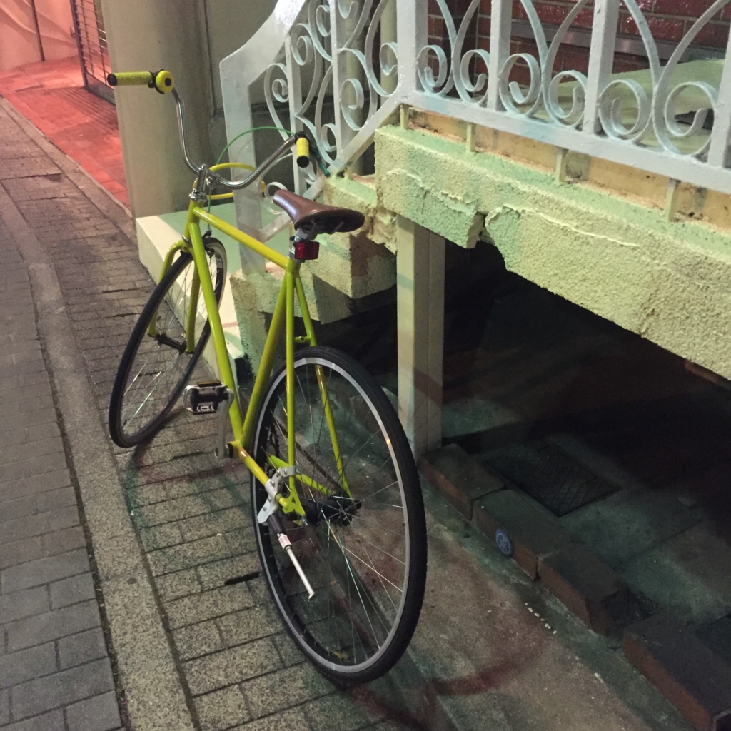 現在のカフェの目印、トクマスターの幸福の黄色い自転車。