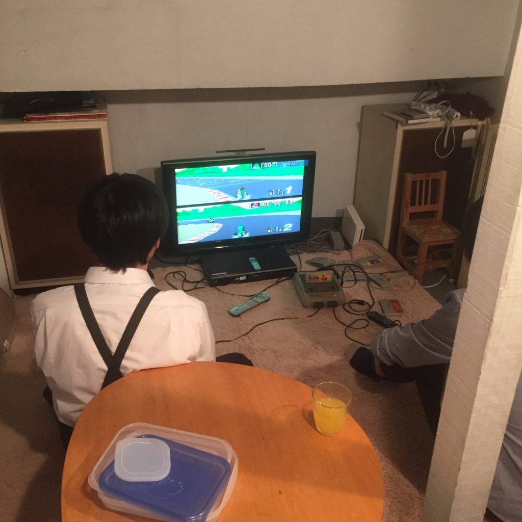 トクマスターとお客さんがスーファミのマリオカートやるの図。この後、テトリスもやる。接客には手を抜かないトクマスターでした。
