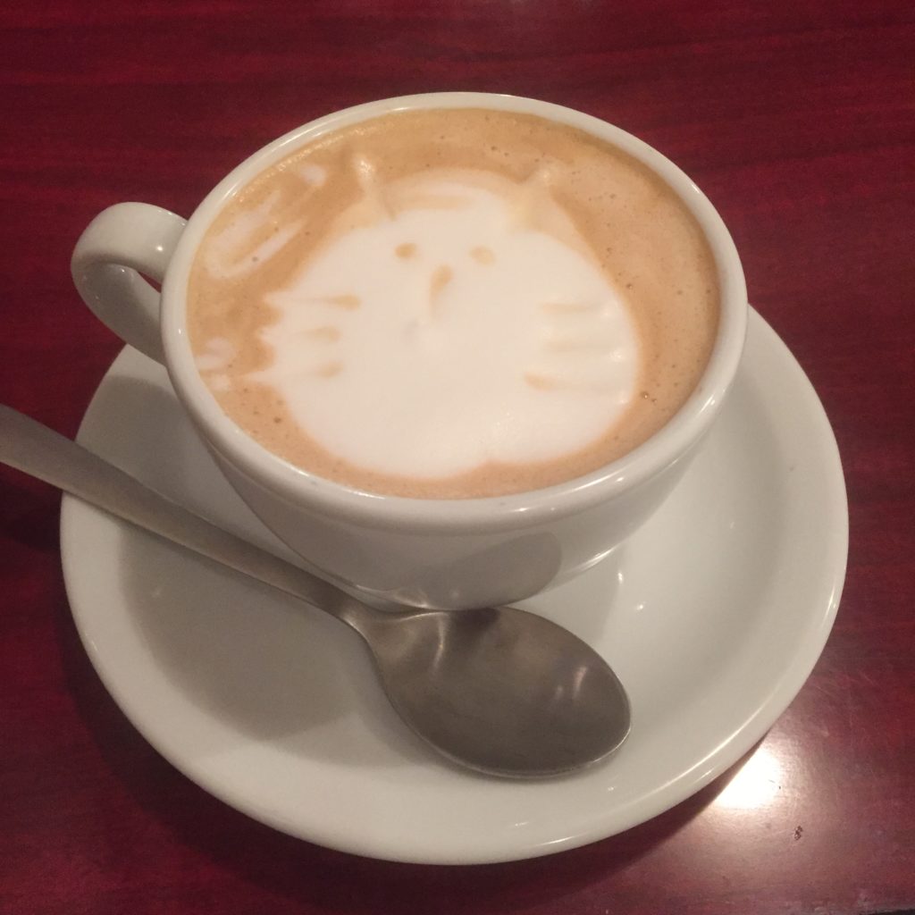 カフェラテを注文しました。猫のお医者さんのラテアートです。