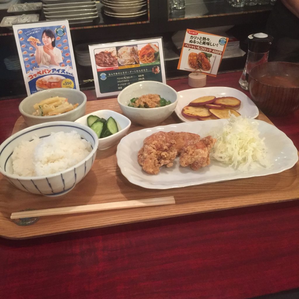 晩ご飯は、鶏唐揚げ、さつまいもバター焼き。