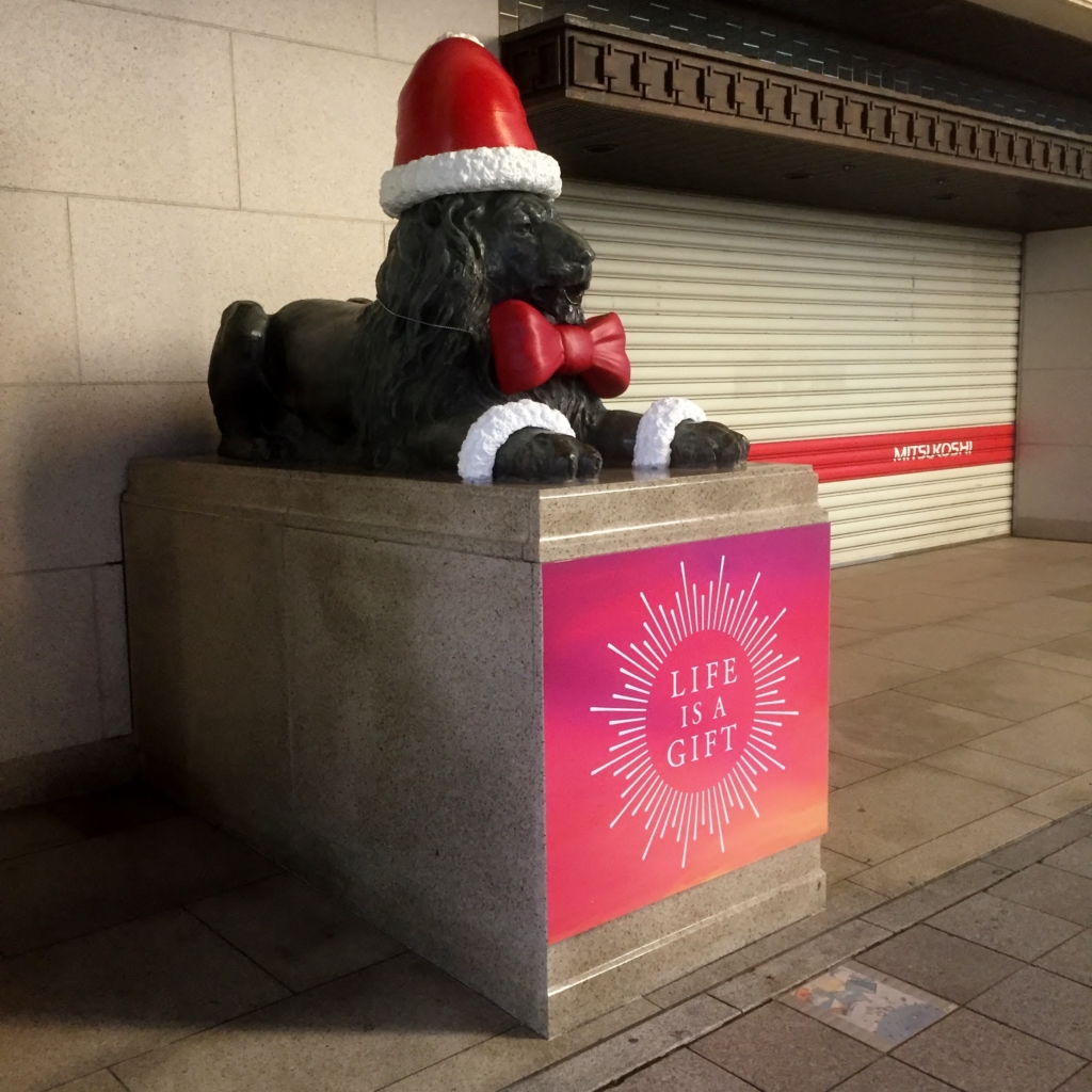 名古屋栄の三越のシンボル、ライオンさんは川崎家狼ストリートライブを聴いています。(ツイキャス配信をしていたためライブの写真がありません。)