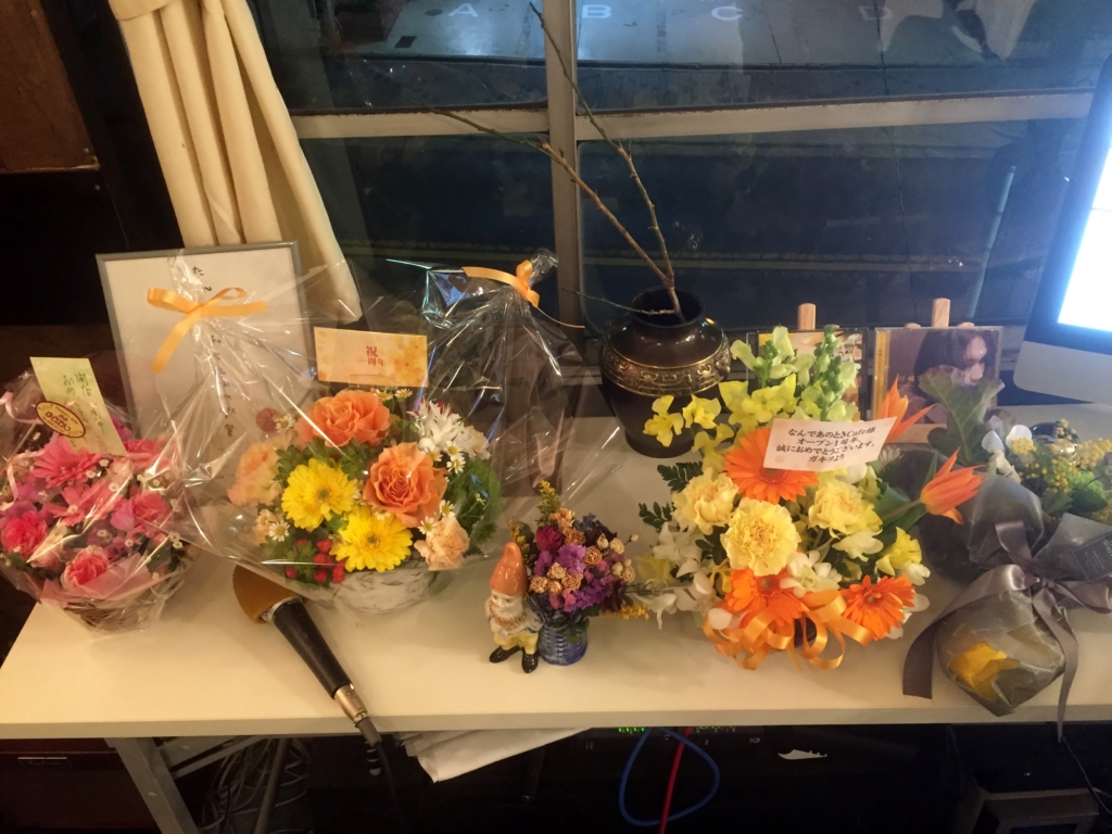 お祝いのお花がたくさん!一周年を記念して、川崎家狼さんがグランドプレオープンで披露してくれたカフェのテーマソング「なんであのとき…」等を歌ってくれて、みんなで歌いました。