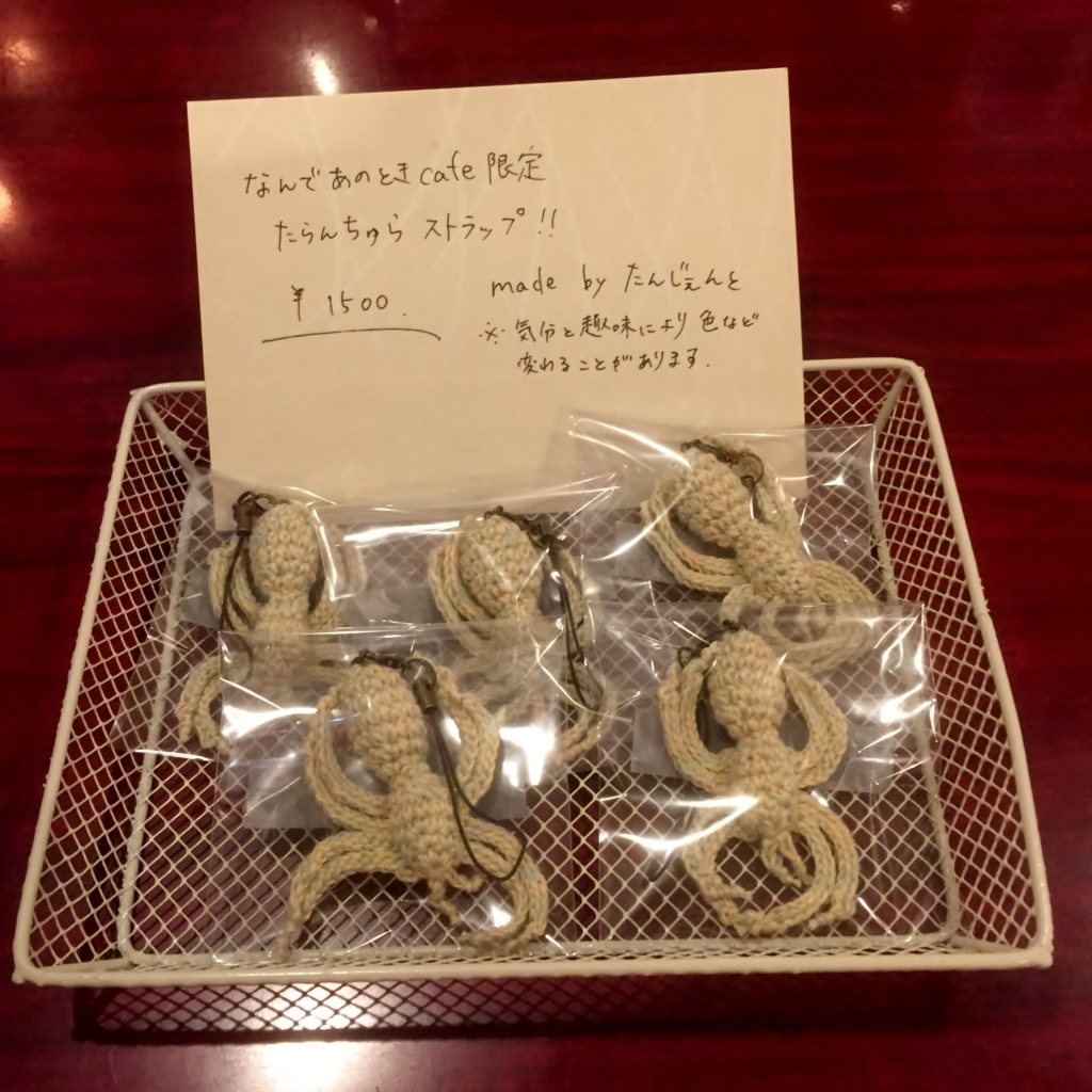 なんであのときcafe限定「たらんちゅらストラップ」が店内にありました。編み物教室のたんじぇんと先生の作品です。