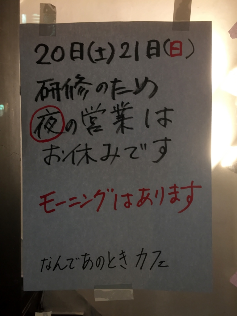 村作りの研修のため土日の夜営業がない。モーニングはある。