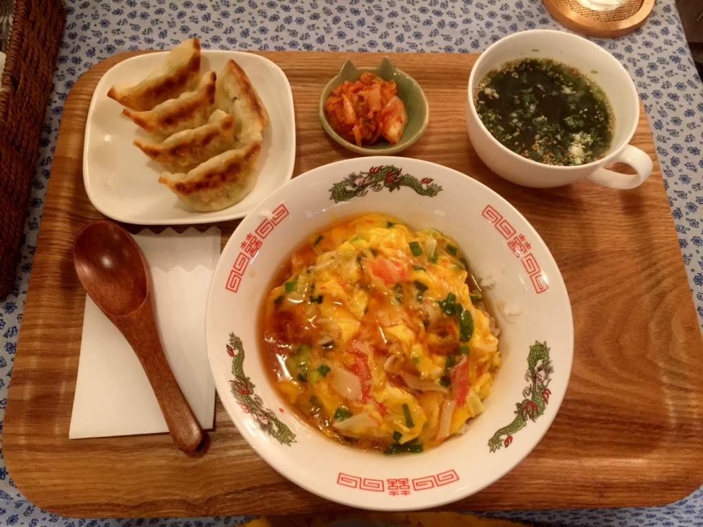 トクマスん家の晩ご飯定食は、天津飯+餃子+わかめスープ+キムチ。