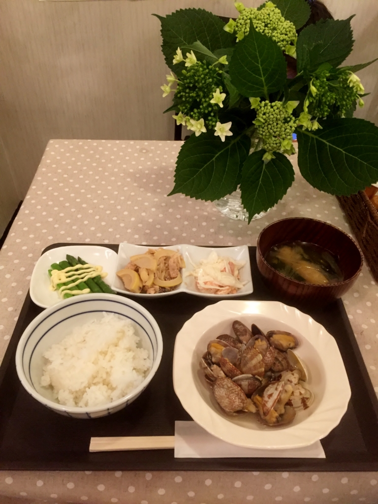 トクマスん家の晩ご飯定食は、アサリの酒蒸し。奥に写っているのはアジサイです。
