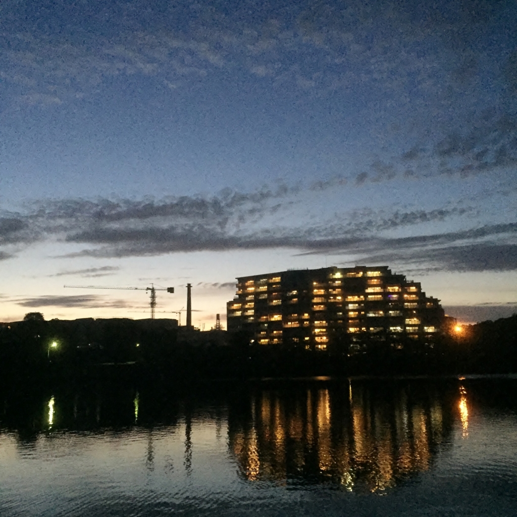 カフェに行く前に猫が洞池に寄りました。夕方の池と向こう岸のマンションの風景が気に入っています。