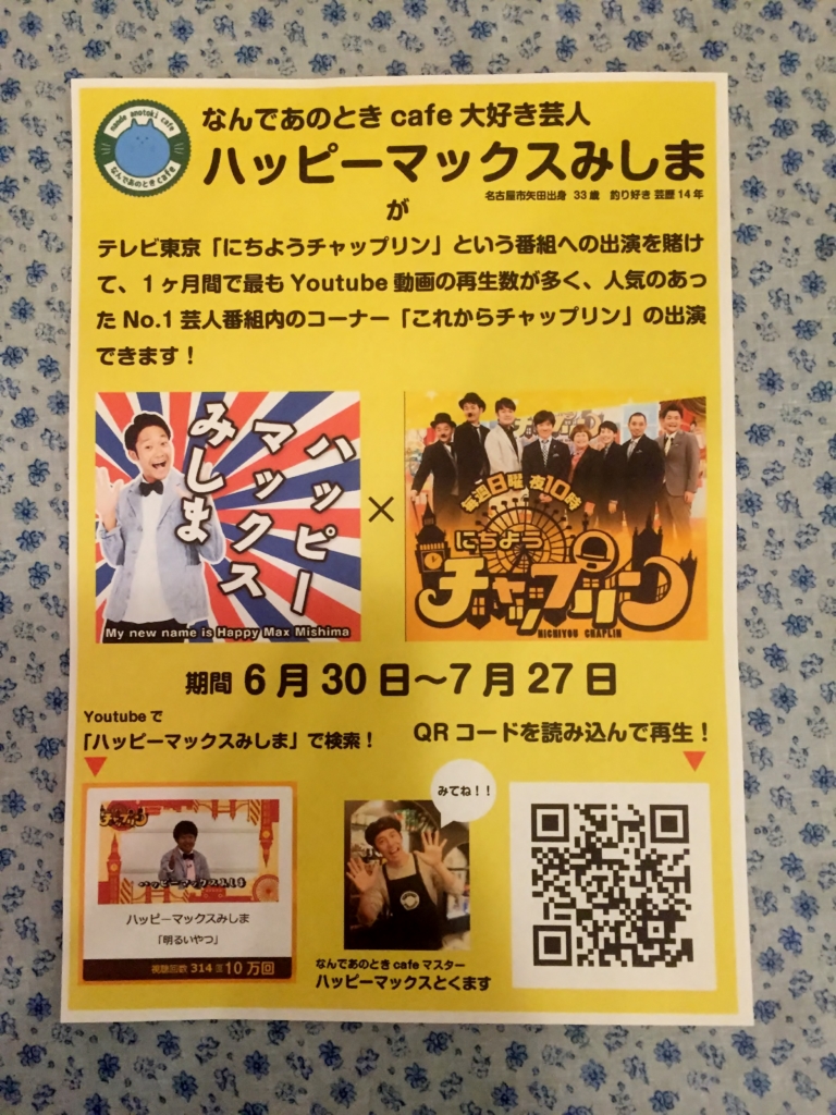 トクマスターの留守中に名古屋出身の芸人「ハッピーマックスみしま」さんが来店し、いろいろやってくれたらしいです。たくさん書いてありますがYouTubeの動画がたくさん再生されるとTVに出れるようです。