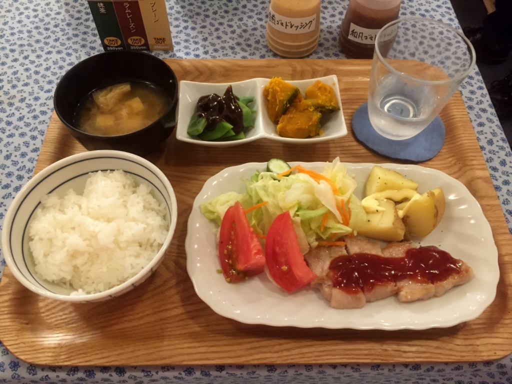 晩ご飯定食は、豚肉と玉ねぎのさっぱり煮です。