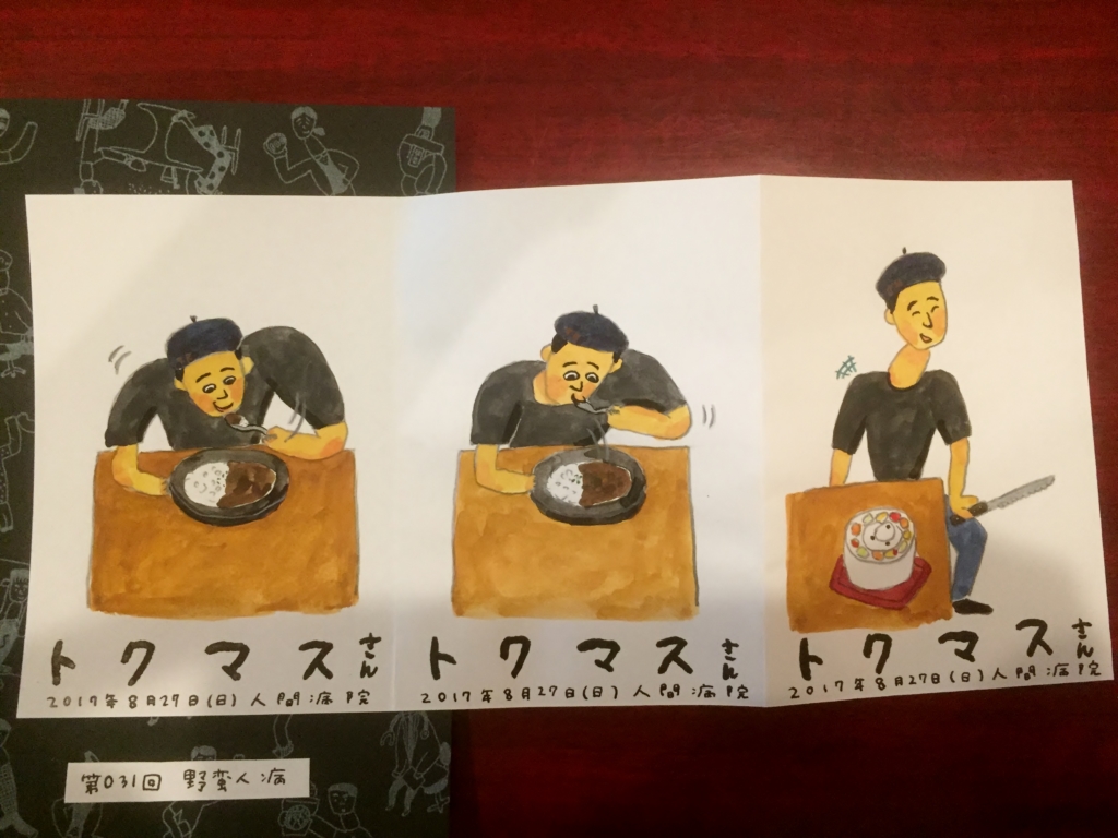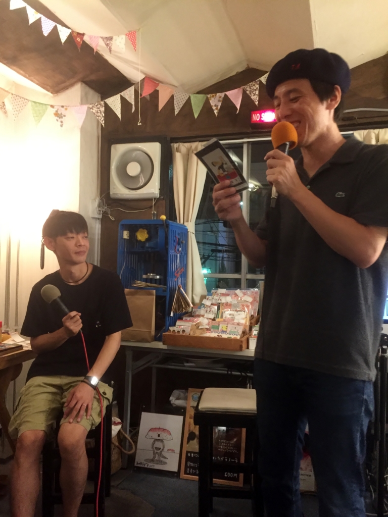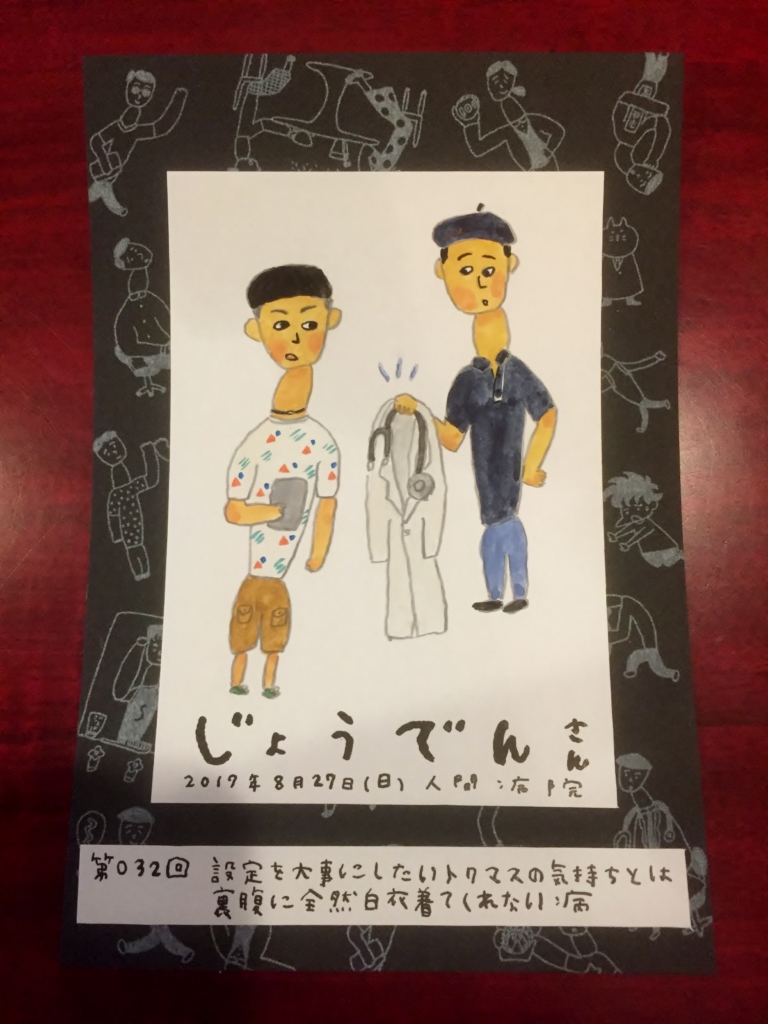 ひらめぐ商店さんのイラスト個展中の最後のイベント、人間病院の公開収録2回目。じょうでん先生とトクマスタケシさんがお互いの病気を発表しました。