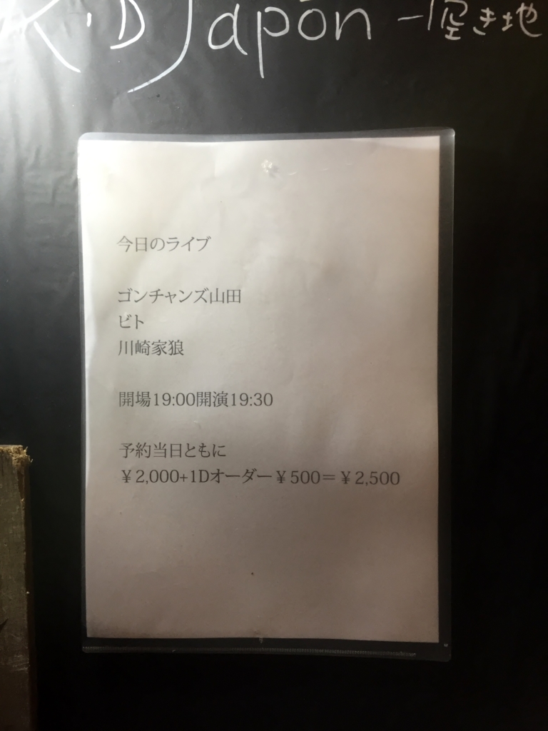 今日は鶴舞のK.Dハポンでの川崎家狼くんが出るライブに来ています。出番は3番目です。