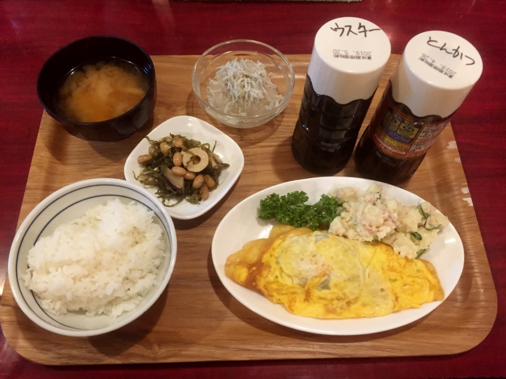 晩ご飯定食は、オムレツでした。ウスターソースか、とんかつソースをかけてお召し上がりください。
