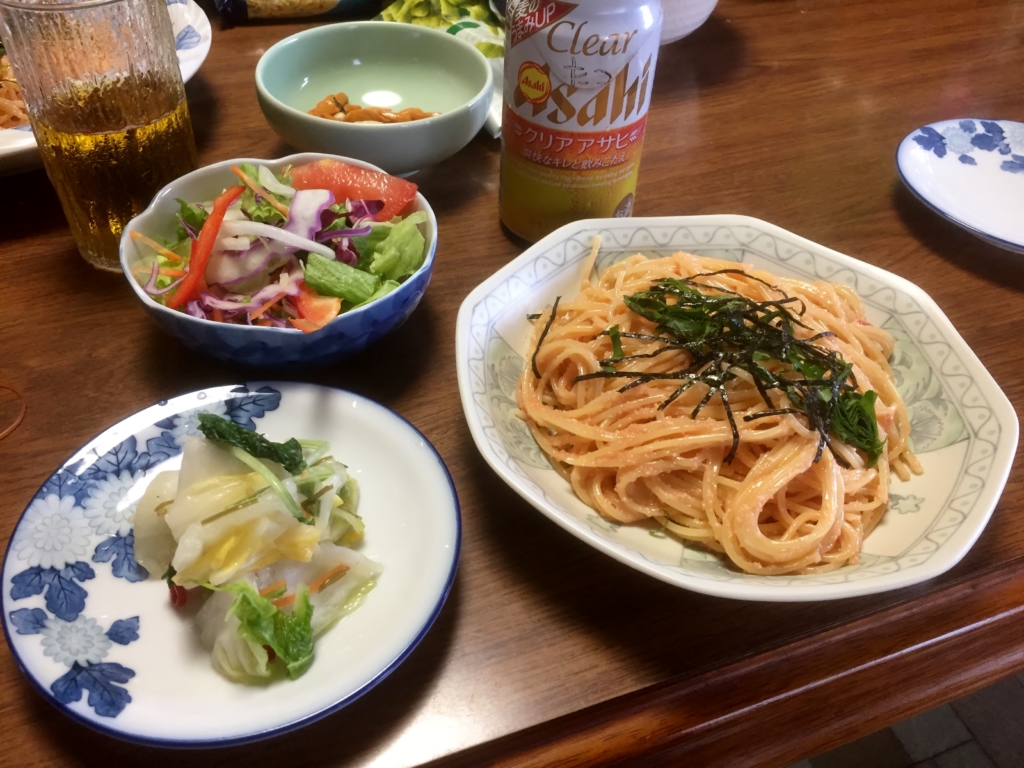 村の昼食は明太子パスタです。