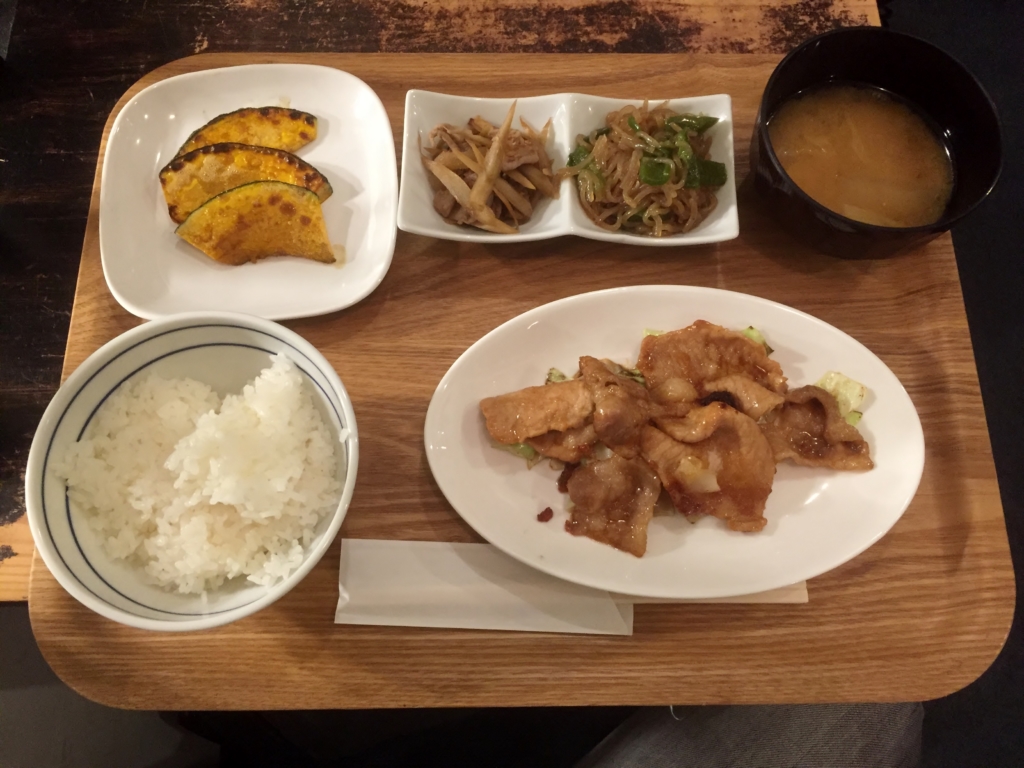 晩ご飯定食は豚肉の生姜焼きです。