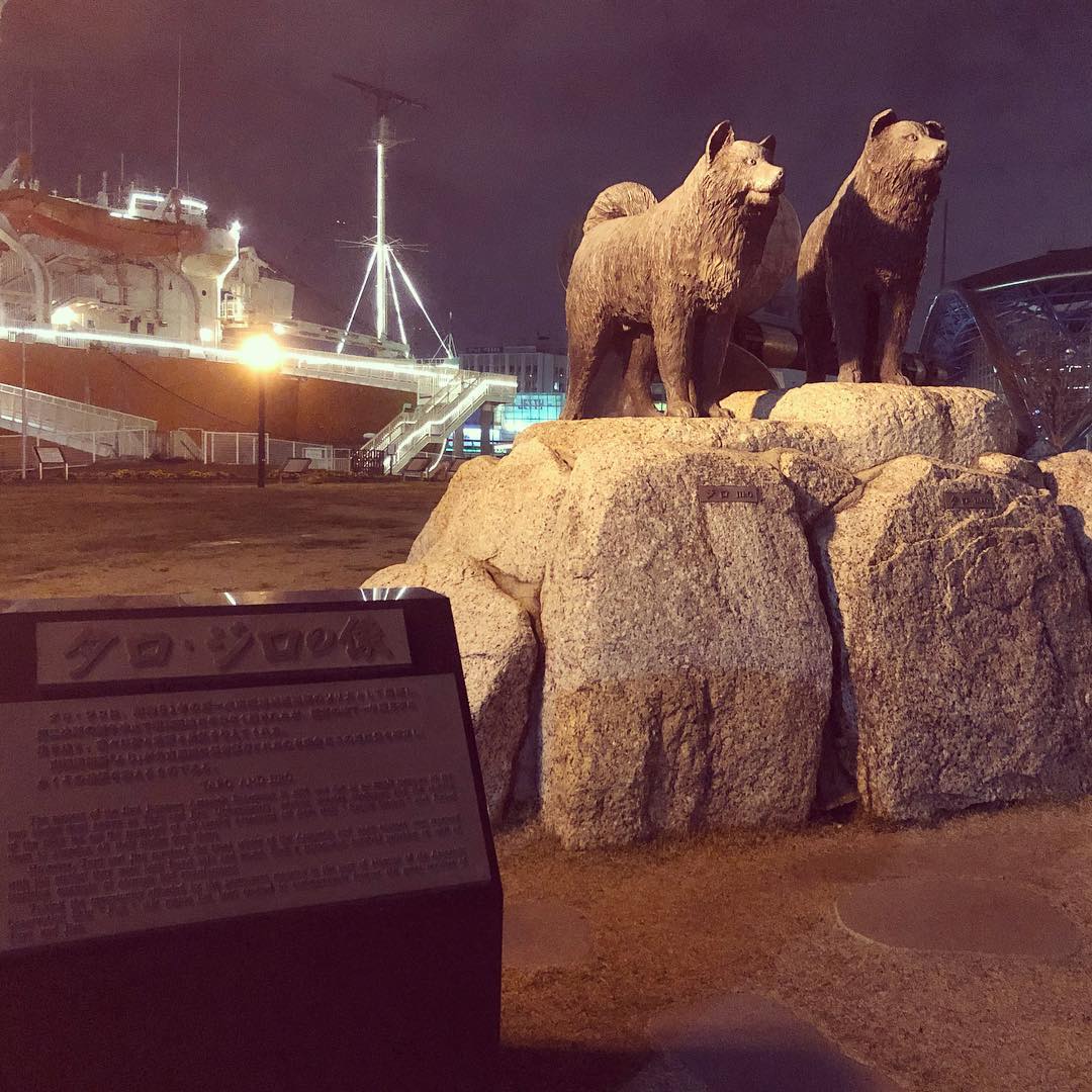 南極地域観測隊に同行した樺太犬の兄弟「タロとジロ」の像があります。映画「南極物語」は小学校の授業で見たような気がする。