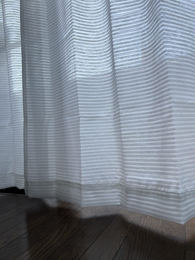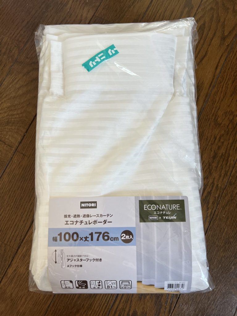 幅100cm、丈176cmで2枚入り、お値段は5,000円弱でした。採光・遮熱・遮像レースカーテンのエコナチュレボーダーです。