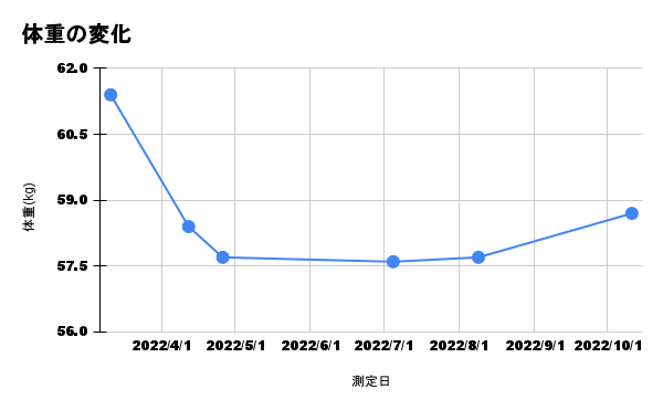 10月10日の体重58.7kgをグラフにプロットしました。先回の8月9日から1kg増えてしまいました。