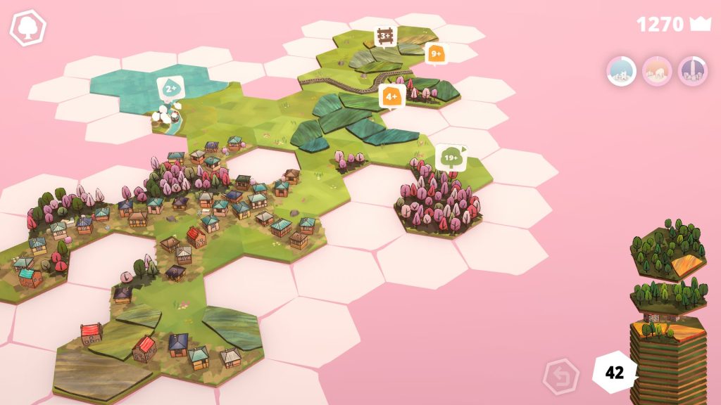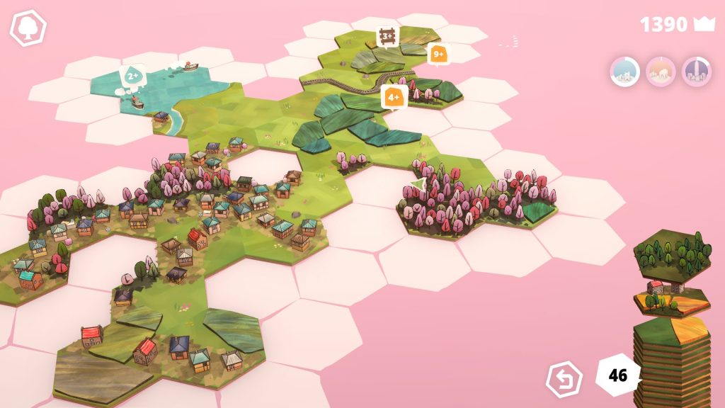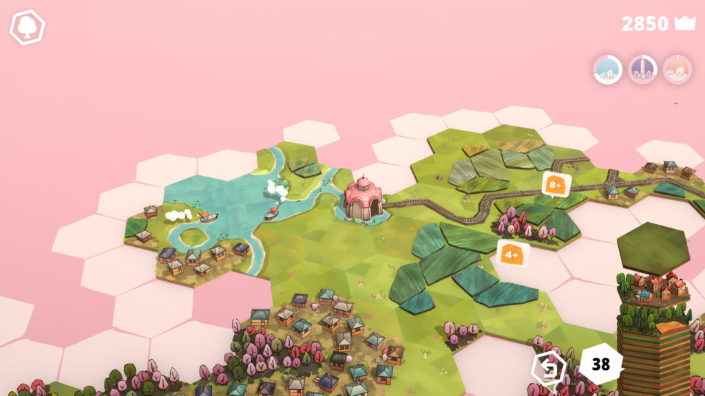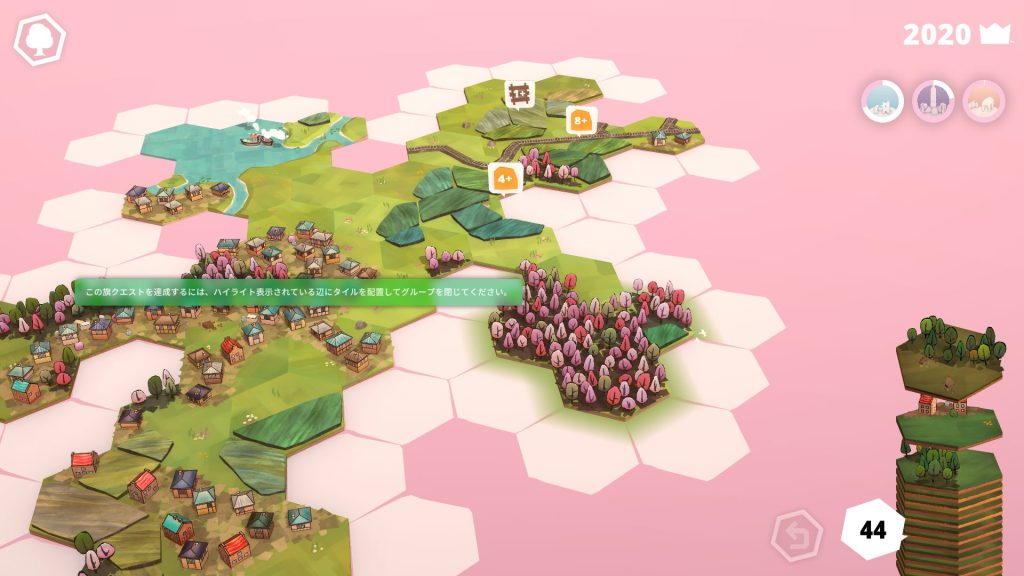 「水上駅」(下の画面で中央のピンク色の屋根の建物)は、川と鉄道を結合することができます。最初は出てこないですが、実績を解除することでランダムで「手持ちのタイル」に出てきます。