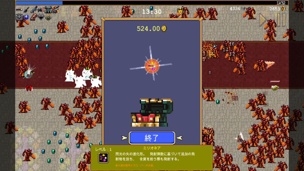 「閃光の矢」から「ミリオネア」への進化条件は「最大値の腕甲とクローバーが必要」でしたが、「最大値の腕甲」でいけるようになってた。ゲーム画面では「最大値の腕甲とクローバーが必要」って書いてるけどクローバーが無くても進化できています。